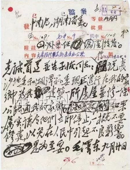 這是1950年9月20日,當毛主席聽說湖南省要在韶山修路建房時,親筆給時任中南局書記的鄧子恢、湖南省委書記黃克誠和省政府主席王首道寫電報,文中寫道:據說長沙地委和湘潭縣委現正進行在我家鄉為我建筑一所房屋并修一條公路通我的家鄉。如果屬實,請令他們立即停止,一概不要修建,以免在人民中引起不良影響。是為至要。